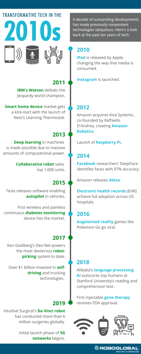 Technology quietly transformed the way we live throughout the 2010s. The rapid pace of revolutions and evolutions came and went so quickly that companies like Apple, Amazon, Netflix quickly became tokens in our households and our daily lives. Perhaps most incredibly, this all occurred in an unrealized, ubiquitous manner over the course of just ten short years. At ROBO Global, we stand with conviction behind the incredible investment opportunity that lies in these very technologies and the tremendous growth potential that we anticipate in the coming decades.