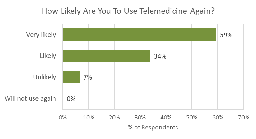 Looking forward, we asked our respondents who have used telemedicine what their likelihood is of using it again. The vast majority (93%) indicated they would use it again, with 59% indicating that they were very likely to use it again.