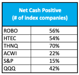 The weighted average Net Debt to EBITDA ratio for the ROBO Index was just 0.2x at the end of 2019, and 56% of its members hold a net cash position (net debt <0), compared with approximately 15% of S&P 500 index members and 22% of MSCI ACWI index members