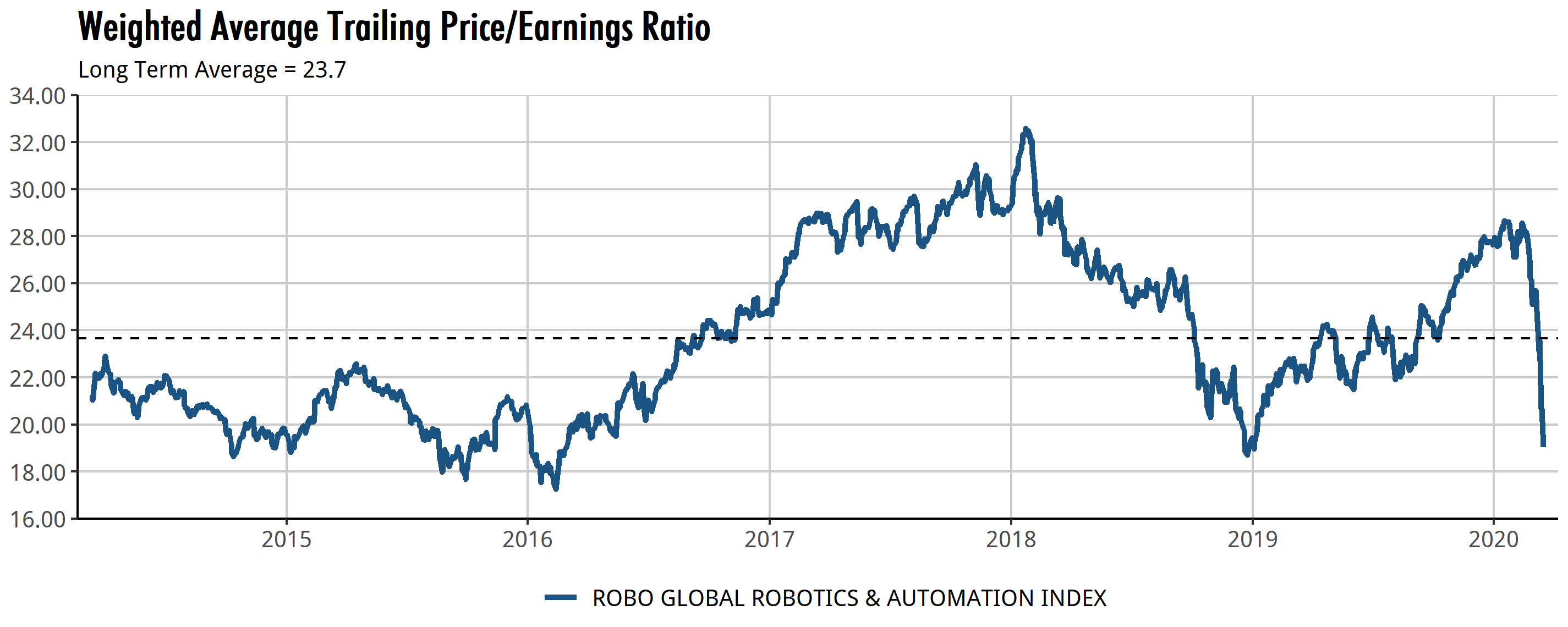 The ROBO Index was down 28% year-to-date as of 16 March 2020 and trades on a trailing P/E of 19.0x, compared to the 5-year average of 23.7x and a historical range of 17-32x.