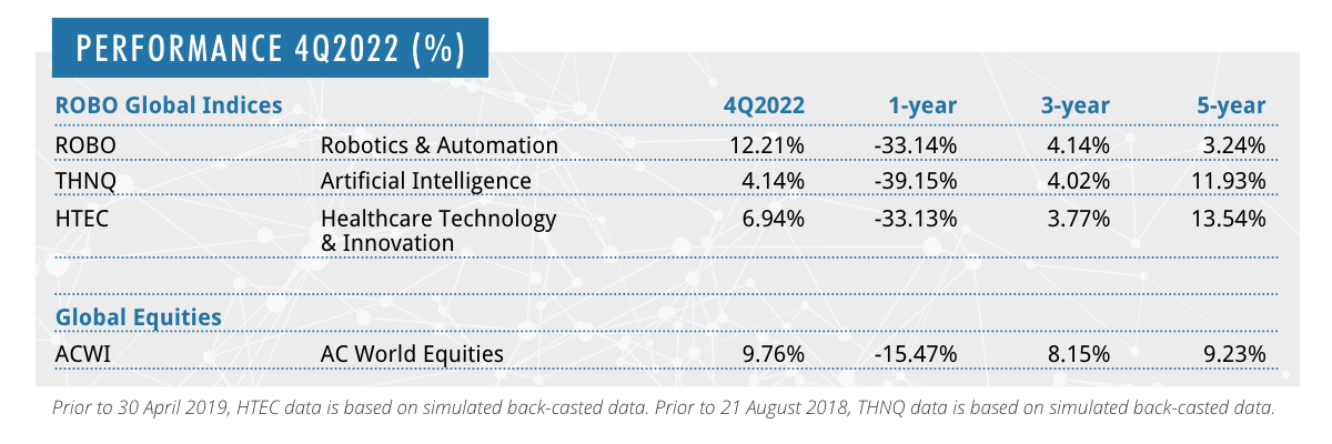There is likely more growth to be seen across the landscape of automation, including robotics, AI, and healthcare technology. Yes, stocks are coming off their worst year since 2008, but one of the best things about the New Year is the opportunity for a fresh slate. As evidenced by the gains across our indices, 4Q22 brought some stabilization and green shoots that may be setting the stage for growth.