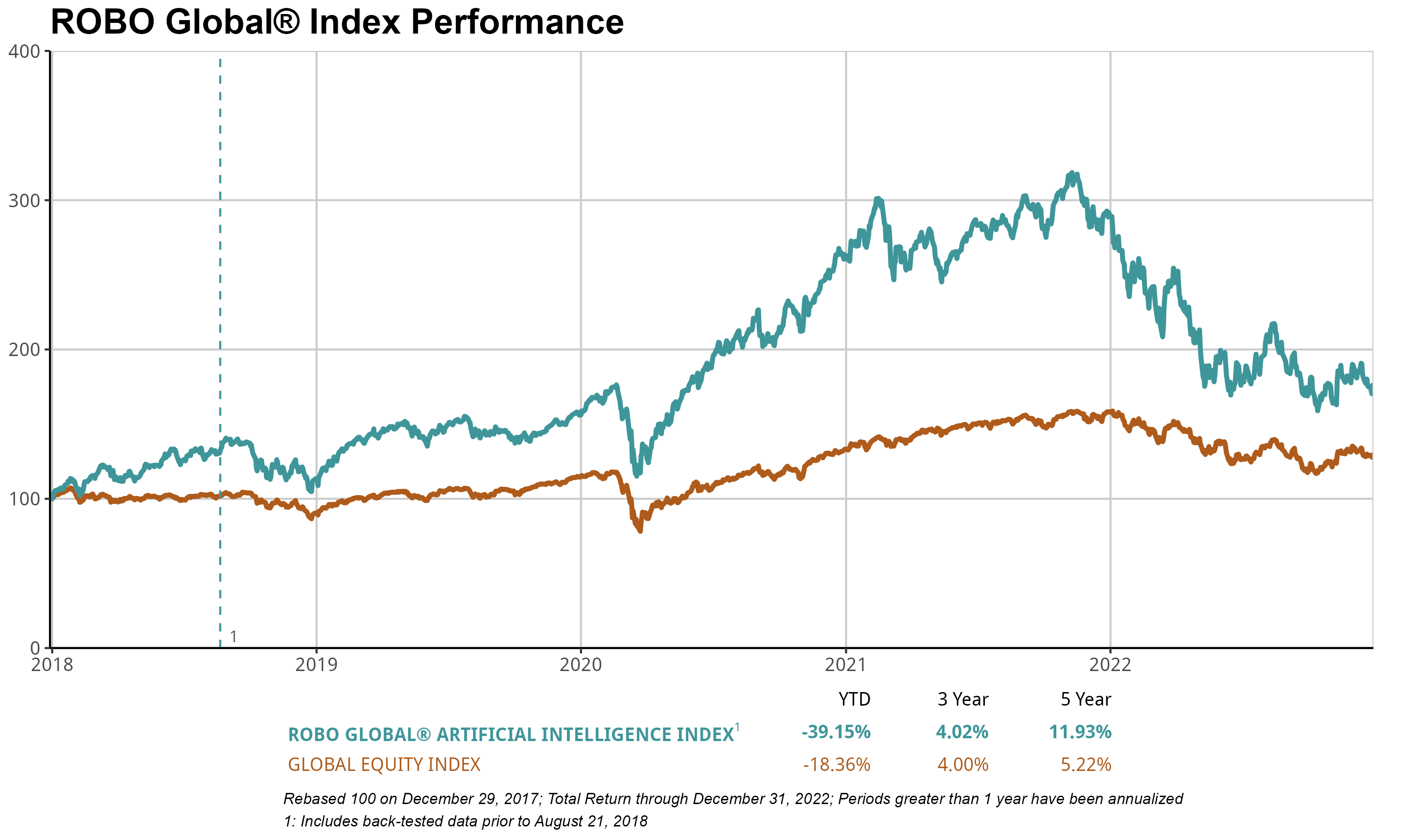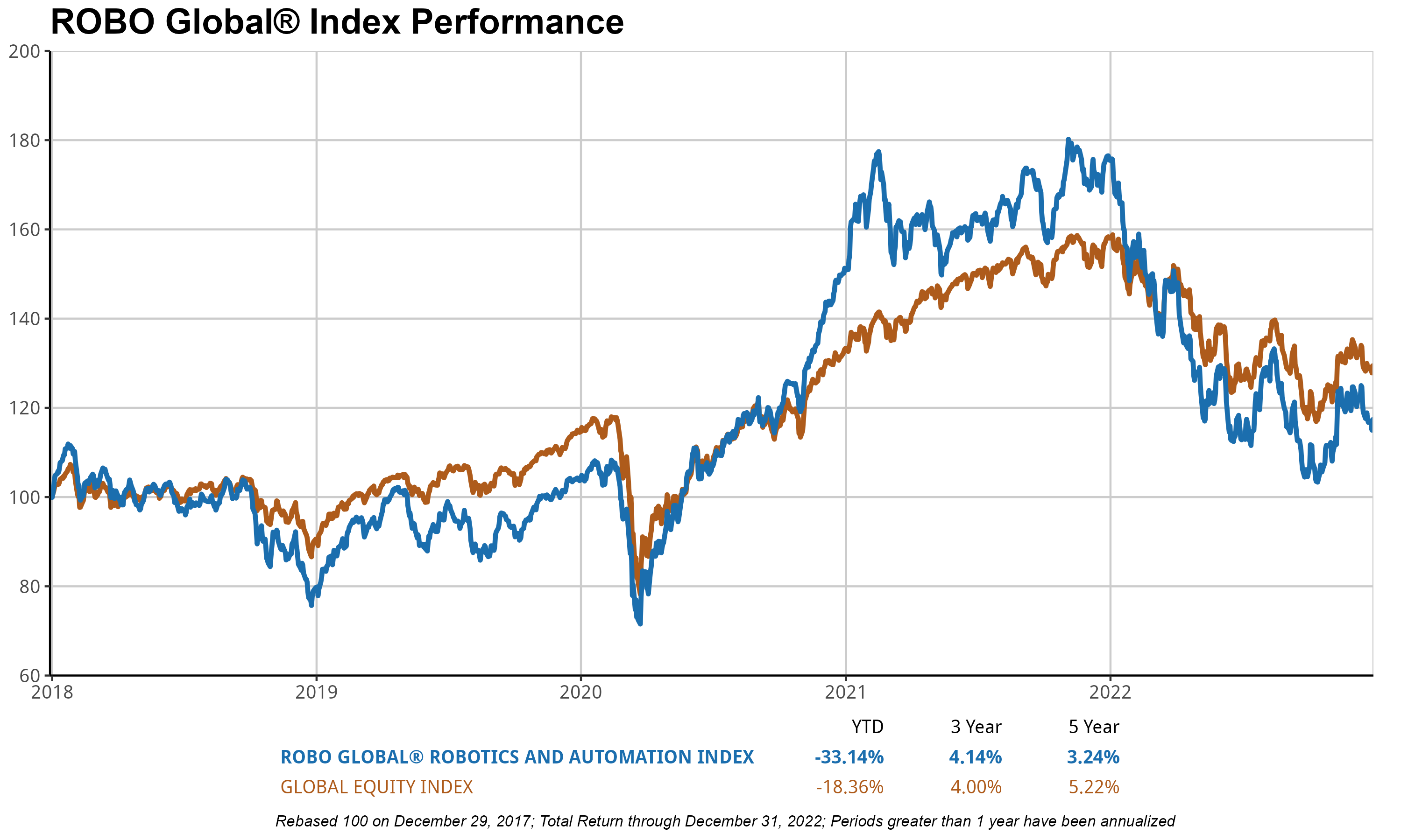 But there was positive news as well, with 2022 bringing important breakthroughs in automation—the sole focus of our research at ROBO Global. In artificial intelligence (AI), Dall-E and ChatGPT demonstrated the profound impacts of technology using generative AI that enables anyone to create illustrations and text at lightning speed with just a few simple instructions to a computer program. On the robotics front, pandemic-driven supply chain disruptions created a major push toward factory and warehouse automation, thrusting companies that deliver collaborative robots and adaptive-control machining into the spotlight. We believe automation continues to be one of the world’s most consistent and profitable themes.